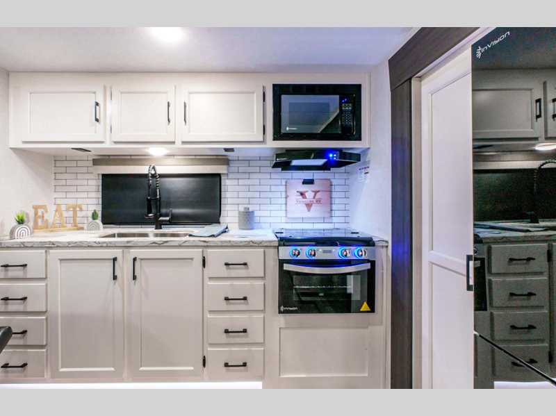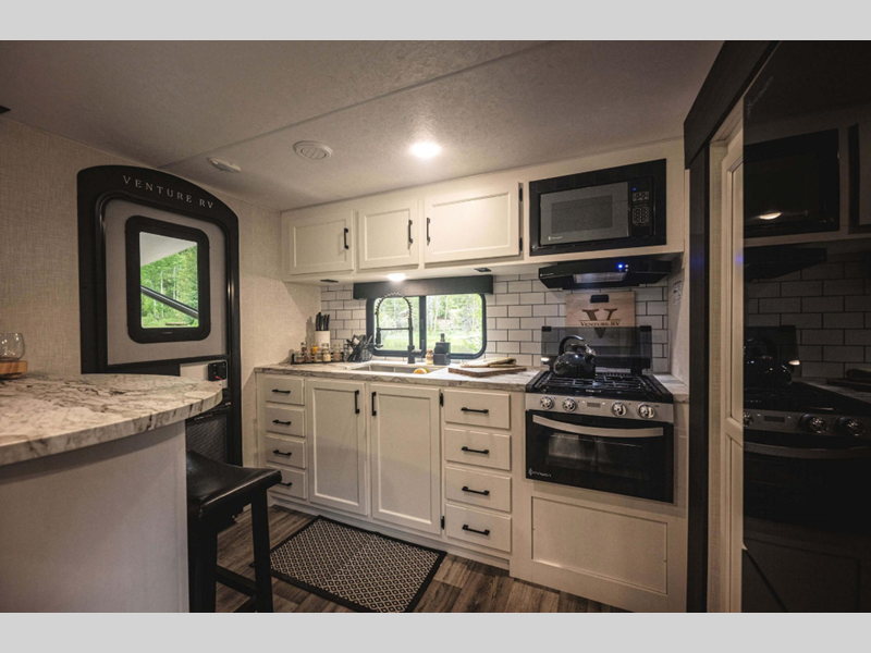 The Venture RV Stratus travel trailers have it all! From an eye-catching exterior to stunning interior décor, a significant amount of storage, and a long list of handy features. They even have clever concealed spaces for organization that is out of sight like the storage bins under the dinette.